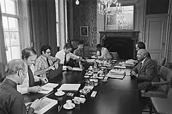 For the CDA, the priority was also not entirely on the success of a cabinet, but on the formation of real unity in the CDA.[11] Within the parliamentary group there was division about governing. with the PvdA. ARP members led by Wim Aantjes were in favor, while KVP members such as Frans Andriessen and especially CHU members wanted to enter into confrontation. In any case, the starting point for participation in a cabinet with the PvdA was equality. For example, the CDA wanted as many ministerial positions as the PvdA. They did not want D'66 in the coalition anyway — after all, the party was not needed for a majority — so they thought that PvdA itself should give up ministerial positions for D'66. Another place for PvdA in the socio-economic triangle was out of the question, because Den Uyl, as Prime Minister, was constantly interfering with it. Van Agt had to return to Justice if he did not want to remain in Parliament. The CDA preferred to discuss abortion first and discuss the reform proposals in a broader socio-economic context.[12]
