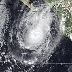 Two areas of disturbed weather focused south of the Gulf of Tehuantepec on October 1, one of which with origins as a tropical wave, underwent binary interaction and merged into one larger system the next day.[5] The disturbance was upgraded to a tropical depression around 18:00 UTC, and it further intensified into Tropical Storm Rosa by 00:00 UTC on October 3.[6] Rosa moved around the western periphery of an upper-level ridge,[5] strengthening over warm waters as it did so. The cyclone became a hurricane by 00:00 UTC on October 4, ultimately attaining peak winds of 85 mph (137 km/h) on October 4.[6] An aircraft reconnaissance plane intercepted the storm around this time, finding a 35 mi (56 km) elliptical eye open to the southwest.[5] Rosa moved northwest over colder waters, transitioning to an extratropical cyclone around 06:00 UTC on October 7 and ultimately dissipating west of Baja California after twelve hours.[5][6]