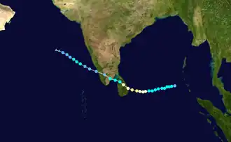 The storm formed on 17 November over the southwest Bay of Bengal. It intensified gradually, reaching a peak intensity of 220 kmph (140 mph),[2] while the Joint Typhoon Warning Center analyzed the storm as a Category 2 equivalent cyclone on the Saffir–Simpson scale on November 23.[3] The cyclone made landfall in Batticaloa at its peak intensity by the same night. It emerged over the Gulf of Mannar on the 24th. That same evening, the storm made its second landfall in Kilakkarai in Tamil Nadu with one-minute sustained winds of 85 kmph (50 mph).[4] The storm then moved back into the ocean around the Kerala coast. It spent its remaining days over Arabian Sea, eventually dissipating on 29th November.