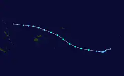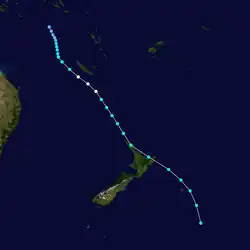 During January 9, the extratropical remnants of Tropical Cyclone Paul briefly moved into the region, before they moved back into the Australian region during the next day.[3][1] The remnants subsequently moved back into the region during January 12, when they were last noted to the south of New Zealand's South Island.[3] The precursor tropical depression to Severe Tropical Cyclone Simon, developed within the monsoon trough, to the northeast of New Caledonia during February 20.[1] Over the next day the system moved eastwards and into the Australian region, where it ultimately developed into a severe tropical cyclone and impacted Queensland.[3][1] During February 28, Simon's extratropical remnants moved back into the basin and impacted New Zealand, before they were last noted during March 3.[3][1]