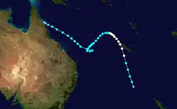 Initially a South Pacific tropical cyclone, Cliff developed on February 9, near Vanua Lava, Vanuatu. The cyclone reached peak intensity on February 12, with an estimated central pressure of 975 hPa. It passed over New Caledonia at near peak intensity, with sustained winds 92 km/h (57 mph). After crossing into the Australian region, Cliff struck Queensland on February 14, making landfall near Bundaberg. The cyclone caused some crop and structural damages in South East Queensland, and beach erosion occurred on the Gold and Sunshine coasts. One man was drowned off the Gold Coast.[4]