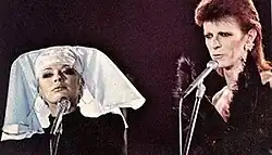 The visual elements of the show referenced the Ziggy Stardust character, who, along with the Spiders from Mars, had been terminated by Bowie after a performance on July 3, 1973. The troupe of dancers wore crocheted cobweb-like costumes, and Bowie sported outfits designed by Freddi Buretti, Kansai Yamamoto and Natasha Korniloff, most notably a body-stocking outfit with a flame motif, as well as a fishnet full-leotard with stuffed gold lamé hands.[4] The keyhole-cutout half-leotard outfit was inspired by the Dada artist/poet Tristan Tzara's 1921 production of Le Cœur à gaz. The choreography by Matt Mattox featured a sequence of dancers spelling out the words "1980", "Floor" and "Show" with their bodies.[4]