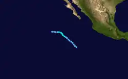 A tropical disturbance south of Acapulco developed into a tropical depression on September 16 and a tropical storm later that day. Kay headed in an irregular but generally west-northwest path out to sea. Kay strengthened into a hurricane on September 17. It continued strengthening and reached its peak as a Category 4 hurricane on the Saffir–Simpson scale on September 18. Kay then slowly weakened and was a tropical storm by September 20. Kay's forward motion slowed as it neared the central Pacific. It restrengthened into a hurricane on September 23, crossed 140°W, and entered the Central Pacific Hurricane Center's area of responsibility the next day.[2] Kay executed a small anticyclonic loop, and then began weakening again. It became a tropical storm again on September 27, and a depression two days later. The cyclone dissipated on September 30 while located north of the Hawaiian Islands.[4] Kay did not effect land, causing no damage or casualties.[2] It was the strongest tropical cyclone of the season at 140 mph (225 km/h). Kay lasted for 14.5 days, enough to make it the fifth-longest-lasting Pacific hurricane at the time.[4]