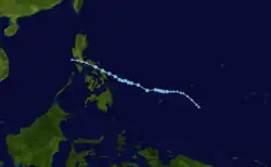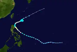 On 16 May, a tropical disturbance began developing west of Kosrae.[14] Three days later, the JMA designated the disturbance as a tropical depression,[7] with the JTWC issuing a TCFA on the system just a few hours after.[14] The next day, both the JMA and JTWC designated the depression as a tropical storm, with the latter agency naming it Forrest.[7][14] On 22 May, Forrest crossed into the PAR, being named Gloring by PAGASA.[3] Steadily developing, the next day, both the JMA and JTWC noted that Forest had peaked with sustained winds of 55 kn (65 mph; 100 km/h).[7][14] After making landfall in Luzon on 25 May, Forrest rapidly weakened,[14] and on 26 May, both PAGASA and the JTWC stopped tracking Forrest.[3][14] The JMA kept tracking a weakening Forrest until it dissipated on 29 May.[7]