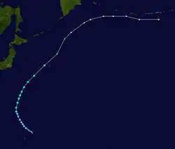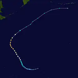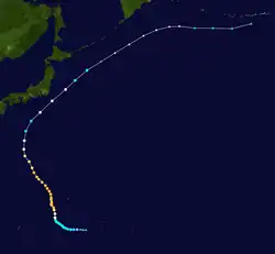 On 11 May, a tropical disturbance located in an equatorial trough east of Chuuk Lagoon began developing. Despite initially showing signs of weakening, the next day, it rapidly developed, becoming a tropical storm a few hours later, causing both the JTWC and JMA to issue their first advisories early on 13 May, with the former naming it Ellen.[13][7] Slightly weakening for a few hours, on May 15, Ellen rapidly intensified, becoming a typhoon a few hours later. Soon after, Ellen deepened significantly, reaching a minimum pressure of 930 mbar (27 inHg) later that day.[7] The next day, the JMA noted that Ellen had peaked with 10-minute sustained winds of 105 kn (120 mph; 195 km/h)[7] while the JTWC stated that Ellen peaked with 1-minute sustained winds of 110 kn (125 mph; 205 km/h).[13] Shortly after, Ellen began recurving northwest towards Japan, weakening as it neared the extratropical cyclone which absorbed Dom. On 21 May, Ellen merged with the cyclone, causing the JTWC to stop tracking it.[13] The JMA kept tracking it until 25 May.[7]