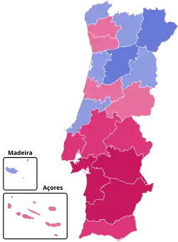 | Aveiro | 161,264 | 46.09% | 177,116 | 50.62% | 2,924 | 0.84% | 4,441 | 1.27% | 3,441 | 0.98% | 699 | 0.20% | 84.56% | |
