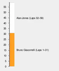 The only car between Jones and the leader now was teammate Reutemann, but with the Driver's Championship already in Jones' hands, there would be no team orders. Understeer induced by a worn left front tire was plaguing the Argentine, however, and Jones easily overcame him on lap 30 and set his sights on Giacomelli, now 12 seconds ahead. The red and white Alfa Romeo coasted to a halt in the Boot on lap 32 with electrical trouble. Once in the lead, Jones went faster and faster, finally doing a 1:34.068 on lap 44, better than his qualifying time.