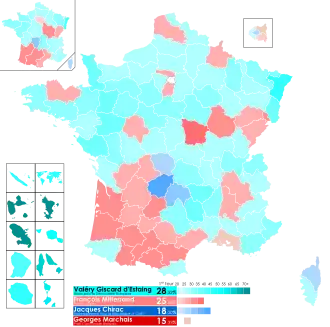 | Valéry Giscard d'Estaing | Union for French Democracy | 8,222,432 | 28.32 | 14,642,306 | 48.24 | |