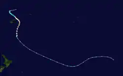 During February 13, a depression developed just to the north of the Marquesas Islands and started moving south-westwards.[15] Over the next four days the system maintained its intensity, before it made a sharp eastwards turn and started to develop further.[15] The system subsequently moved in a counter clockwise loop, which allowed it to develop further and it was declared to be a tropical cyclone and named Nisha by the FMS during February 22.[15] However, by the time Fiji had named it Nisha, the Tahiti Meteorological Service had named it Orama, which was retained in order to save any confusion to the local public.[15] Over the next day, the system started to move south-westwards, while it rapidly intensified, with the FMS estimating 10-minute sustained wind-speeds of 185 km/h (115 mph) during February 24.[15] During that day the system sharply turned south-eastwards and started to gradually weaken, before it was last noted during February 28, as it moved out of the FMS's area of responsibility, while equivalent to a modern-day category 1 tropical cyclone.[15] The Tuamotu Archipelago was the worst hit area with around 30 of its Atolls, either seriously damaged or destroyed with a damage total of around US$1.7 million reported in two villages on Rangiroa.[15]