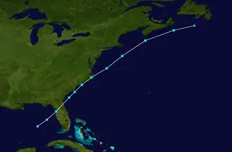 A circulation began to form on June 18 in the eastern Gulf of Mexico, prompting gale warnings.[3] It was declared Subtropical Depression One the same day. The depression made landfall on the morning of June 18 just north of Spring Hill, Florida and gained subtropical storm status over land. The storm was classified as Subtropical Storm One by the National Hurricane Center, as the rule was not to name subtropical storms. The subtropical storm moved to the northeast and crossed the Outer Banks of North Carolina on June 19. Even though the minimum central pressures remained low, the circulation expanded and became distorted. The subtropical storm peaked at 70 mph winds (110 km/h) on June 18, but did not reach its minimum pressure until June 20, when it dropped to 984 mbar (29.07 inHg).[4] The subtropical storm was declared an extratropical storm near the Canadian Maritimes, on the same day.[5][6]