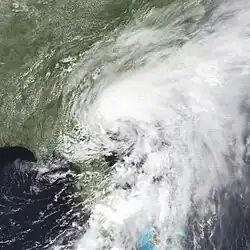 Most of the storm's effects were felt in Florida where it made landfall on the morning of June 18, causing gales, heavy rains, flooding, beach erosion and tornadoes.[9] The highest winds were recorded at 41 miles per hour (66 km/h) and up to 48 miles per hour (77 km/h) during a thunderstorm at Macdill Air Force Base in Tampa on June 18. Rainfall peaked at 10.72 inches (272 mm) in Desoto City, while much of the rest of the state reported between 1–5 inches (25–125 inches) of precipitation.[10][11] High tides and waves caused flooding and beach erosion from Naples to the Tampa Bay area. Some waterfront buildings suffered damage from undermining including widespread damage of marinas and some boats. Several bulkheads and rock revetments experienced minor damage in Naples and Marco Island. Several man‑made dune structures seaward of the Coastal Construction Control Line in Collier County received minor damage at Vanderbilt Beach and Marco Island.[12] Three people were killed in Florida in association with the subtropical storm with a further thirteen people injured. A Brevard County woman died when a canoe overturned and an Orange County child was killed when he was swept into a drainage ditch. 130 families were evacuated a few days after the storm from the Arcadia River area because the Peace River crested above flood stage.[3]