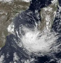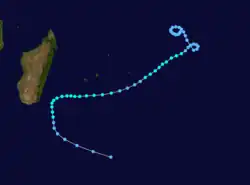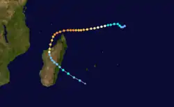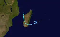 Cyclone Andry reached peak winds of December 9, when MFR estimated winds of 170 km/h (105 mph). The next day, JTWC estimated 1 minute winds of 240 km/h (150 mph).[13] Around that time, Andry was passing just north of the northernmost tip of Madagascar at Diego-Suarez, where the storm produced wind gusts of 250 km/h (155 mph).[1] The cyclone weakened while curving to the southwest and later to the south,[13] making landfall on western Madagascar near Majunga with wind gusts of 198 km/h (123 mph). While over land and turning to the southeast, Andry rapidly weakened into a tropical depression, which later passed near the capital Antananarivo. The storm emerged back into the Indian Ocean on December 14, by which time the system was disorganized.[1] That day, MFR estimated that Andry dissipated, although the JTWC assessed that the system re-intensified slightly and turned sharply southwestward before dissipating over Madagascar on December 16.[13]
