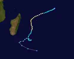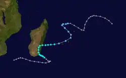 During the season, the Réunion Meteorological Service tracked storms in the basin, using the Dvorak technique to estimate tropical cyclone intensities via satellite imagery.[1] The agency later became Météo-France's meteorological office at Réunion (MFR). At the time, the basin extended from the east coast of Africa to 80° E.[2] Eleven storms were named by the Mauritius Meteorological Service and the Madagascar Meteorological Service.[1] The rest of the naming list was Lalao, Monja, Nora, Olidera, Pelazy, Rija, Saholy, Tsira, Vaosolo, Wilfredy, Yannika, and Zozo.[3] The 11 named storms were slightly above the normal of 9, most of which formed in January and February. There were four intense tropical cyclones, which is twice the average. The increased activity of the season was in part due to enhanced easterlies, a strong monsoon trough, and warm water temperatures around 28 °C (82 °F) which extended to 25° S.[4]