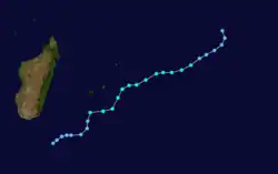 On December 19, a tropical disturbance formed near Diego Garcia, which initially tracked to the south-southeast before turning to the southwest. Later that day, the system intensified to moderate tropical storm status, prompting the Mauritius Meteorological Service to name it Bakoly. The storm gradually intensified into an intense tropical cyclone, reaching peak winds of 170 km/h (105 mph) on December 23. After maintaining that intensity for about 12 hours, Bakoly weakened below cyclone status as it turned to the south-southeast. On December 25, the storm passed between Réunion and Mauritius, and later resumed its south-southwest trajectory. After executing a small loop, Bakoly turned to the southeast and dissipated on December 30.[1][15]