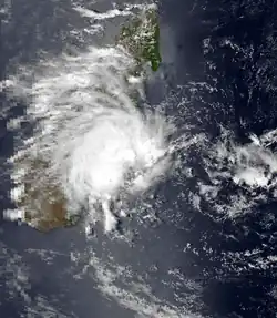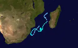 MFR began tracking a tropical disturbance in the Mozambique channel on January 4. The next day, the agency estimated the system intensified into a moderate tropical storm,[18] prompting the Madagascar Meteorological Service to name it Caboto.[1] The storm moved southward along Madagascar's western coast, reaching peak winds of about 65 km/h (40 mph).[18] Caboto made landfall on January 7 to the north of the mouth of the Mangoky River, and crossed the southern portion of the country, emerging near Farafangana into the Indian Ocean. Winds associated with the storm reached 43 km/h (27 mph) at Morondava on the west coast and 63 km/h (39 mph) at Farafangana on the east coast. A developing ridge caused Caboto to slow after it reached open waters, executing a partial loop southwest of Réunion before turning to the south and dissipating on January 10.[1]