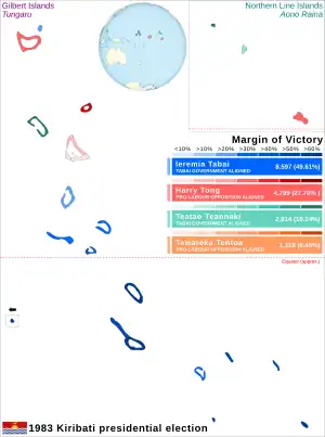 Tabai built his new government to ensure that different religious and regional groups were represented, but he did not make any outreach to the opposition and filled the government exclusively with his supporters.[8] This included Teannaki, who returned to his position as vice president.[13] Tabai was re-elected again in the 1987 election.[14] A challenge to his candidacy in 1987 determined that 1983 was only the second time Tabai was elected president.[15][16] This was because his 1978 election under the colonial government was determined to be separate from his presidential elections, and he succeeded to the presidency upon independence.[17] Teannaki was also a candidate in the 1987 election, and he then won the presidency in the 1991 election. Tentoa was a candidate in the 1994 election, while Tong was a candidate in the 1998 election.[11]
