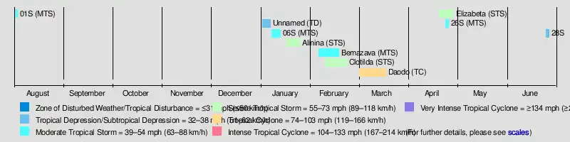 In addition to the storms classified by the MFR, the JTWC tracked four additional storms. The first, classified as Tropical Cyclone 01S, formed on August 1 in the northeastern portion of the basin,[2] an infrequent event for the time of year.[7] The storm moved westward with peak 1 minute winds of 85 km/h (55 mph). It gradually weakened, dissipating on August 3 near Diego Garcia.[8] The JTWC also tracked a short-lived storm in January that they classified as Tropical Cyclone 06S. The storm formed on January 7 in the eastern portion of the basin near Diego Garcia, and reached winds of 85 km/h (55 mph) while moving southeastward. After stalling on January 9, the system dissipated three days later.[2][9] Later, the agency monitored Tropical Cyclone 26S beginning on April 24. The storm formed south of Diego Garcia and moved in a counterclockwise direction, first to the southeast and later to the north. After reaching peak 1 minute winds of 85 km/h (55 mph), the storm dissipated on April 26.[2] The final storm tracked by the agency originated on June 25 in the far northeastern portion of the basin between Diego Garcia and the Cocos Islands. It moved slowly to the southwest, failing to intensify beyond winds of 65 km/h (40 mph). Turning to the southeast, the system dissipated on June 27.[2]