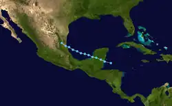 A tropical wave crossed the Caribbean sea, moving into a favorable upper environment in the western Caribbean sea on August 31. The system formed into a weak tropical depression before crossing the Yucatán peninsula, becoming better organized as it moved into the south-central and western Gulf of Mexico between September 1 and 3. The system moved ashore east-central Mexico before quickly dissipating as a tropical cyclone on September 4. Satellite imagery revealed that its residual cloud pattern persisted over Mexico for an additional couple of days before degenerating. Heavy rainfall fell primarily north of its track, with the maximum across northeast Mexico falling at El Barranco/Altamira, where a total of 9.33 inches (237 mm) was measured.[31]