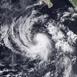 A tropical disturbance developed on September 27 within 250 mi (400 km) of the Mexican coastline.[2] The disturbance was upgraded into Tropical Depression Twenty-Three on 0000 UTC September 28. Tropical Depression Twenty-Three moved west-northwestward, lured poleward by an upper-level trough near northern Mexico. At 0000 UTC September 30, the depression became Tropical Storm Paine, southwest of Acapulco. Roughly 21 hours later, a NOAA Hurricane Hunter flight found winds of 90 mph (140 km/h), upgrading Paine into hurricane. The hurricane peaked as a Category 2 hurricane on October 1 as it turned northwest, headed towards the Gulf of California. Hurricane Paine did not intensify further due to the presence of mid-level wind shear and dry air.[2] The outer eyewall moved across Cabo San Lucas, and the resultant land interaction was believed to have slightly weakened the inner core of the hurricane.[31] Paine moved ashore near San José, Sonora with winds of 100 mph (160 km/h). The storm weakened as it moved over land going through Mexico and then entering the United States. Paine dissipated on October 4 over Lake Michigan.[2][32]