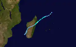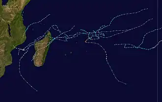 During the season, the Météo-France office (MFR) on Réunion island issued warnings in tropical cyclones within the basin. Using satellite imagery from National Oceanic and Atmospheric Administration, the agency estimated intensity through the Dvorak technique, and warned on tropical cyclones in the region from the coast of Africa to 90° E, south of the equator. The World Meteorological Organization recognized the MFR as a Regional Tropical Cyclone Advisory Centre in 1988, and would later label the agency as a Regional Specialized Meteorological Center in 1993.[1] The Joint Typhoon Warning Center (JTWC), which is a joint United States Navy – United States Air Force task force, also issued tropical cyclone warnings for the southwestern Indian Ocean.[2] The season's nine named storms is equal to the long term average, while the five tropical cyclones – a storm attaining maximum sustained winds of at least 120 km/h (75 mph) – was slightly below average.[3] The MFR considered the tropical cyclone year to begin on August 1 and continue to July 31 of the following year.[1]