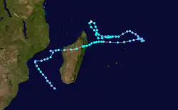 On January 22, a tropical disturbance formed to the southeast of Diego Garcia.[13] It moved generally to the west-southwest, intensifying into a tropical storm on January 23. That day, the Mauritius Meteorological Services named the storm Doaza,[14] and the JTWC classified it as Tropical Cyclone 09S.[2] On January 25, Doaza passed north of Tromelin Island,[14] and around that time it attained an initial peak of 80 km/h (50 mph).[13] Later that day, the storm struck eastern Madagascar near Île Sainte-Marie, and it quickly weakened over land,[14] so much so that the JTWC discontinued advisories.[2] However, Doaza emerged into the Mozambique Channel on January 26 near Mahajanga and soon after reorganized while curving to the south.[14] The JTWC again issued advisories on January 28,[2] around which time Doaza passed just southeast of Juan de Nova Island. On the next day, the storm attained tropical cyclone status, reaching winds of 135 km/h (84 mph) just west of Europa Island. On January 30, the JTWC estimated peak 1 minute winds of 215 km/h (134 mph), by which time the storm was moving due southward.[13] Doaza turned to the southeast and quickly weakened, dissipating within the westerlies on February 1.[14]
