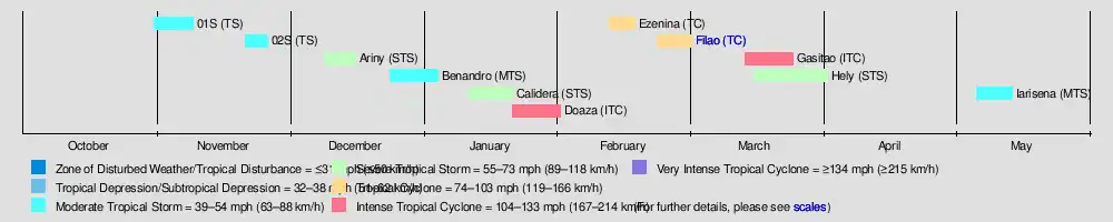Cyclone Filao was the most notable storm of the season, originating in late February off northern Madagascar. It ultimately struck Mozambique on March 1, where it killed about 100 people and left $10 million in damage (1988 USD). In January, both tropical storms Calidera and Doaza crossed Madagascar, the latter of which helped end a drought. Long-lasting Tropical Storm Hely also struck the country in March. The strongest cyclone of the season was Gasitao, which formed at the same time as Hely and attained peak winds of 150 km/h (93 mph). The season ended when Tropical Storm Iarisena dissipated northeast of Madagascar in the middle of May.