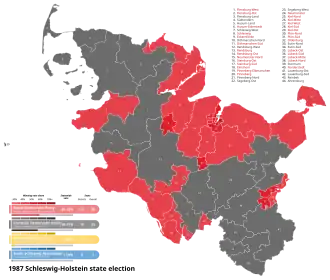 The 1987 Schleswig-Holstein state election was held on 13 September 1987 to elect the members of the Landtag of Schleswig-Holstein.[1] The election resulted in a deadlock, with both the left-leaning parties (SPD and SSW) had 37 seats, and the right-leaning parties (CDU and FDP) had 37 seats, and concluded with the Barschel affair.