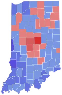 Ancestral Democrats along the Ohio River in Southern Indiana delivered for Bayh, where he won every county with margins upward of 60%. He also performed well in Southwestern Indiana, notably in Vigo County, where Bayh was born, as well as where his father, Birch, began his political career.[5]