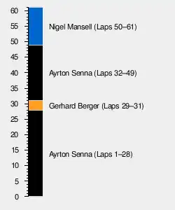 At the start, with both Ferraris on the front row (Mansell on pole, Alain Prost second), Mansell got too much wheelspin and slid across the track towards Prost, who had to avoid being shunted into the pitwall. All of this allowed the McLarens of Ayrton Senna and Gerhard Berger to slip past Mansell and Prost to make it a McLaren 1–2 with Senna leading into the first corner. After all the mid race tyre stops, it was Senna who emerged as the race leader, followed by Mansell, Berger, and Prost. A few laps later Mansell had caught Senna and passed him into turn one (Senna letting him through, unlike the year before when they collided).