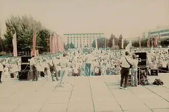 Among the most serious of the strikes began on 1 March 1991.[11] Supported by the pro-independence People's Movement of Ukraine (abbr. Rukh) organisation,[6] the strikes brought the conflict to a new level, calling for Gorbachev's resignation, the dissolution of the Council of People's Deputies, and recognition of the 1990 Declaration of State Sovereignty of Ukraine. They were supported by miners from the Lviv-Volyn coal basin, who marched to the Ukrainian capital of Kyiv. The leaders of Rukh met with miners in Donetsk, and in April 1991 miners occupied the main Khreshchatyk street in Kyiv.[11] Following the 1991 Soviet coup attempt and subsequent Declaration of Independence of Ukraine, strikes did not come to an end, although they decreased in strength and focused primarily on being paid unpaid wages.[12]
