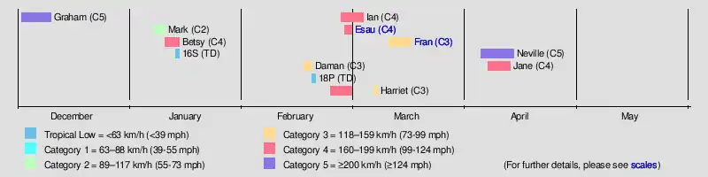 Esau 29 February – 1 March Category 4 Severe tropical cyclone 185 km/h (115 mph) 925 hPa (27.32 inHg) Solomon Islands Unknown Unknown None