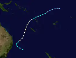 A deep depression formed from gale-force westerlies on 5 January. The depression continued to intensify as it drifted slowly west and became a Category 1 cyclone the next day. During the next 12 hours, Betsy rapidly intensified while moving south-southeast slowly. Mean winds associated with the cyclone reached storm-force late on 7 January and the system turned to the southwest and subsequently the cyclone approached the central Vanuatu Islands. By 1800 UTC 8 January, Besty developed hurricane-force winds. Six hours later, the core of the cyclone struck the islands of Ambrym and Malakula in central Vanuatu while developing a large ragged eye. Betsy continued to intensify after existing Vanuatu, and reached maximum intensity very early on 10 January while located 200 km (120 mi) north of New Caledonia. By 11 January, Besty had become less organized. Meanwhile, the eye shrunk and became ragged. was losing organisation, with the large eye (diameter of 165 km) rapidly shrinking and becoming elongated and ragged. Midday 11 January, Betsy recurved sharply to the south and by 13 January Betsy had dissipated. However, the extratropical remnants passed close to the northern coast of New Zealand on 17 January. On Malakula, sustained winds of 118 km/h (73 mph) were recorded between 0400 and 0500 UTC 9 January and the pressure dropped to 959 mbar (28.3 inHg). Tropical cyclone Betsy was blamed for significant damage in Vanuatu and was responsible for the deaths of two people. The worst impact was felt on Efate, where there was a 3 m (9.8 ft) storm surge.[3]