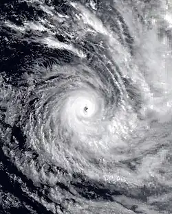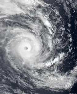 Midday on 10 April Jane made its closest point of approach to Cocos Island, passing 200 km (120 mi) away from the island. As the storm continued to track south, it came under the influence of a deep-layer easterly steering flow caused by the presence of a ridge to the south. Jane turned onto a westward track which it maintained for nearly five days. Cyclone Jane continued to intensify under an ideal environment. On 13 April, a well-defined eye appeared on satellite imagery. A day later, the storm reached its peak intensity of 230 km/h (140 mph), making the storm one of the strongest of the year.[21]