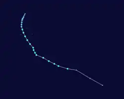 Early on December 8, the NWOC reported that Wasa had peaked with 1-minute sustained windspeeds of 195 km/h (120 mph), which made it equivalent to a category 3 hurricane on the SSHWS.[14] The next day, the FMS estimated peak 10-minute winds of 165 km/h (105 mph), making Wasa a Category 4 severe tropical cyclone.[5][14] Over the next few days, the system weakened into a tropical depression after passing through the Society and Austral Islands.[1][15] The NWOC issued their final advisory on Wasa on December 13, as the system turned northeastward to warmer waters.[13][14][15] Later that day, Wasa became sufficiently organized to be reclassified as a category 1 tropical cyclone by the FMS, who renamed it Arthur.[1] Over the next 24 hours, Arthur passed about 80 mi (130 km) north-northwest of Mururoa, which reported winds of 70 km/h (45 mph).[15] On December 14, the FMS reported that Wasa-Arthur had reached its secondary peak intensity of 130 km/h (80 mph).[1][15] The cyclone maintained this intensity while moving eastward through the uninhabited Acteon Group of islands and other atolls. On December 15, the NWOC classified it as Tropical Cyclone 08P, with peak 1-minute winds of 85 km/h (55 mph).[1][15][16][17] On December 16, the system gradually weakened into a shallow depression, and both the FMS and the NWOC issued their final advisories on Wasa-Arthur.[15]