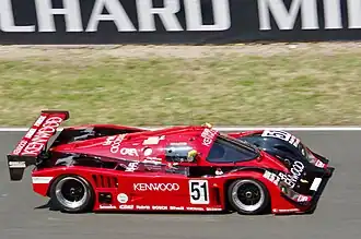 Mazda had known their race-winning Mazda 787B was being rendered obsolete under the new regulations, so started investigating a potential 3.5-litre car. Mazdaspeed used their connection to sister-company Jaguar, through their parent Ford company, to order their XJR-14 composite monocoques. They were fitted with Judd V10 Formula 1 engines, badged as Mazdas. Overseen by their successful racing engineer, Nigel Stroud, adjustments were needed to fit in the longer engine. The model, called the MXR-01, needed much work to upgrade it from a sprint-car to an endurance racer. The biggest work was put into the engine, strengthening both it and its Hewland transmission. However, with an output of 600 bhp and a top speed of only 325 kp/h, the performance was underwhelming, giving away around 20 kp/h to their Peugeot and Toyota rivals.[15][16][14] Five chassis were purchased, four of them came to Le Mans with two as test-cars. The winning team of 1991, Volker Weidler, Johnny Herbert and Bertrand Gachot, had one car, again decked out in the same orange-&-green Renown livery as their previous steed. The second car would be driven by their Japanese veterans Yojiro Terada and Takashi Yorino, with Brazilian Maurizio Sandro Sala.[15]