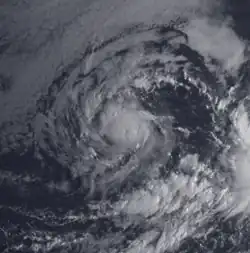 Late on July 15, Hurricane Frank passed about 175 mi (282 km) south of Socorro Island. A station on the island reported winds of 67 mph (108 km/h), which indicated that the hurricane had a large wind field.[42] Slow intensification continued, and Frank intensified into a major hurricane, or a Category 3 on the Saffir-Simpson Hurricane Scale, on July 17.[6] By that time, the eye had become well-defined,[43] and later became surrounded by a ring of deep convection. On July 18, Frank reached its peak intensity of 145 mph (233 km/h) well to the west-southwest of the Baja California peninsula.[44] By July 20, winds dropped below major hurricane intensity, and by the evening, Frank was just a Category 1 hurricane.