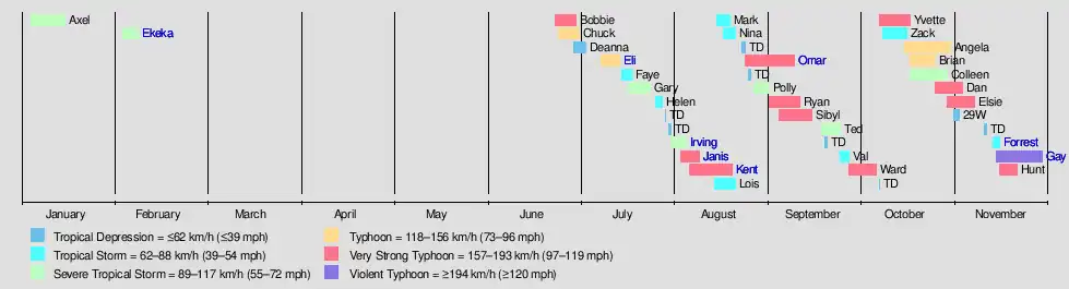 | Gay (Seniang) | November 14 – 29 | Violent typhoon | 205 km/h (127 mph) | 900 hPa (26.58 inHg) | Marshall Islands, Caroline Islands, Mariana Islands, Guam, Japan, Aleutian Islands | None | 1 | |