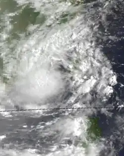 On 2 January, stronger-than-normal low-level westerlies were observed east of New Guinea. As a result of these increased winds and an area of cloudiness, two areas of convection on different sides of the equator formed. The next day, these areas began consolidating.[4] As a result, on 4 January, the Japan Meteorological Agency (JMA) noted that the northern area of convection had developed into a tropical depression.[5] Several hours later, the Joint Typhoon Warning Center (JTWC) issued a Tropical Cyclone Formation Alert (TCFA) on the depression, issuing their first warning on Tropical Depression 01W later that day.[4] Early on 6 January, both the JTWC and JMA had noted that the tropical depression had intensified into a tropical storm,[5][4] causing the former agency to name it Axel.[4]
