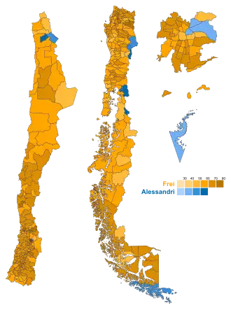 General elections were held in Chile on 11 December 1993 to elect the President, members of the Chamber of Deputies and elected members of the Senate.[1] Eduardo Frei Ruiz-Tagle of the Concertación alliance was elected president, and the alliance also won a majority of seats in the Chamber of Deputies and maintained its majority in the Senate. As of 2025, this is the most recent presidential election that did not result in a runoff.