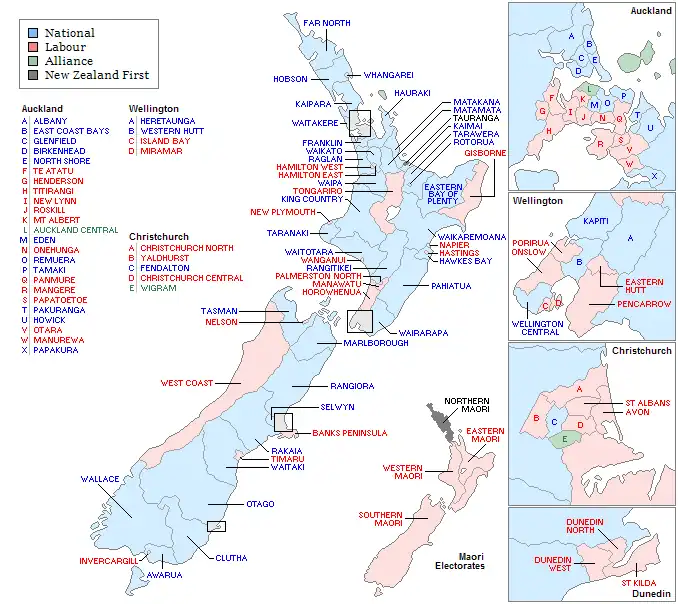 Based on the 1991 New Zealand census, an electoral redistribution was carried out; the last one had been carried out in 1987 based on the previous census in 1986.[21] This resulted in the abolition of nine electorates, and the creation of eleven new electorates. Through an amendment in the Electoral Act in 1965, the number of electorates in the South Island was fixed at 25, so the new electorates increased the number of the North Island electorates by two.[22] In the South Island, one electorate was abolished (Ashburton), and one electorate was recreated (Rakaia). In the North Island, five electorates were newly created (Eastern Bay of Plenty, Far North, Howick, Matakana, and Wellington-Karori), five electorates were recreated (Franklin, Hauraki, Henderson, Onslow, and Waitakere), and eight electorates were abolished (Bay of Islands, Clevedon, Coromandel, East Cape, Maramarua, Ohariu, Wellington Central, and West Auckland).