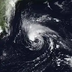 A frontal low situated between Bermuda and South Carolina developed into Tropical Depression Two late on July 6.[21] Strong wind shear initially prevented significant strengthening,[22] though by early on July 7, the depression became Tropical Storm Barry. A nearby trough enhanced convection and caused strengthening, with maximum sustained winds reaching 70 mph (110 km/h) later that day.[21] Later on July 8, Barry weakened slightly, falling to winds of 50 mph (80 km/h), an intensity it would retain until landfall.[21] An approaching mid-level trough accelerated the storm as it traveled roughly along the Gulf Stream.[23] Early on July 9, convection began to shift away from the storm's center. While moving rapidly northeastward, Barry made landfall in Hart Island, Nova Scotia, late on July 9.[21]