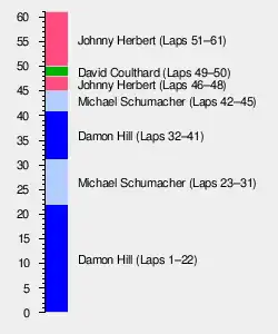 At the front of the field, Hill moved back into the lead of the race when Schumacher made his pit stop on lap 31, rejoining in second place with a deficit of 20 seconds.[37] Hill now pushed hard in his efforts to build up a sufficient lead over Schumacher—setting the race's fastest lap time of 1:29.752 on lap 37—to maintain first place after his second pit stop.[1] Salo began the second round of pit stops on the next lap, and was followed in due course by Alesi, Herbert, Barrichello, Boullion, Gachot, Blundell, Panis and Coulthard.[1] Coulthard's stop, despite moving him ahead of Alesi, was problematic: his car's electronic failure meant that his pit-lane speed-limiter system did not work, and he exceeded the 80 kilometres per hour (50 mph) pit-lane speed limit, an infraction of the Sporting Regulations which, like jumping the start, entailed a ten-second stop-go penalty.[17][35][38] Hill made his own second stop on lap 41 with a 27-second lead over Schumacher and the two were almost level as Hill reached the end of the pit lane, but Schumacher's extra momentum allowed him to move ahead in the run to the Maggotts, Becketts and Chapel sequence of fast corners.[29] At the completion of the scheduled pit stops by lap 44, the running order was Schumacher and Hill in close attendance, then a gap back to a similar battle between Herbert and Coulthard, then Alesi, Blundell, Barrichello, Panis, Frentzen—whom Panis had just passed for the third time—Martini, Badoer, Salo, Boullion, Gachot and Moreno, the last of whom retired four laps later with a lack of hydraulic pressure in his Forti's pneumatic engine valves.[1][14]