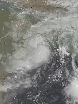 In Bangladesh, the third storm produced a 3 m (10 ft) storm surge and heavy rainfall, reaching 147 mm (5.8 in) over 24 hours in Chittagong.[9] About 100,000 people evacuated their houses to storm shelters due to the floods, while another 100,000 were stranded in their homes due to floods.[10] Many embankment dams were damaged, furthering flooding.[11] On Hatia Island, the storm wrecked over 5,000 homes and 10,000 ha (25,000 acres) of crops,[9] with salt and shrimp farms in the region also destroyed. A 1.8 m (6 ft) storm tide flooded dozens of villages around Cox's Bazar, destroying about 1,000 houses.[10] Two bridges were destroyed, severing traffic between Cox's Bazar and Chittagong. In the latter city, 20,125 houses were damaged or destroyed.[12] Over 60,000 people were left homeless in the country, and there were 60 deaths related to the storm.[2] However, the rains also helped end a damaging five-month drought in the country.[10] The government provided wheat and cash to affected residents to help cope with the disaster.[12] After the storm moved through the area, most freshwater ponds were intruded by saltwater, furthering damage to crops and causing a shortage of drinking water.[11] About 50,000 people became ill after drinking contaminated water, killing around 400 people due to a diarrhea outbreak.[13]