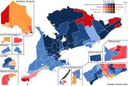 ![]() Popular vote by riding. As this is an FPTP election, seat totals are not determined by popular vote, but instead via results by each riding. Click the map for more details. | |||||||||||||||||||||||||||||||||||||||||||||||||