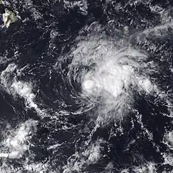 On May 15 an area of disturbed weather in the Intertropical Convergence Zone developed into a tropical depression. The disturbance was not readily traceable back to a tropical wave from the Atlantic. On its first day of its existence, Tropical Depression Two-E was a well-organized system with maximum sustained winds of 35 mph (56 km/h) and a minimum central pressure of 1,006 mbar (29.7 inHg).[15] As it slowly moved west, Two-E experienced a few intermittent bursts of convection. However, the depression gradually became less organized during the remainder of its life. On May 18, the cyclone's organization deteriorated markedly until it dissipated the next morning.