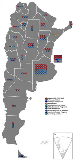 Presented with a unique opportunity following his once mighty party's poor showing at the 1995 polls, former president and UCR leader Raúl Alfonsín negotiated an alliance with the center-left FrePaSo and, though in a number of provinces - including the second-largest (Córdoba) - the UCR and FrePaSo ran on different slates, the Alliance won a majority of congressional seats in 13 of 23 provinces and in the city of Buenos Aires. The results marked the twilight of Menemists' dominance of Argentine politics.[1][2]