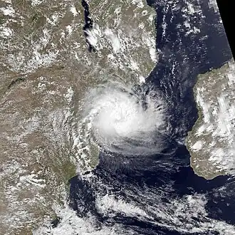 On February 24, following decreased pressures across the northern Mozambique channel after Josie's demise, the ITCZ spawned a tropical wave. An atmospheric circulation began to subsequently develop along the wave axis as it was centered just offshore the Mozambique coast. Situated in an environment with warm sea surface temperatures,[3] the system was first classified by MFR late on February 24, though the JTWC did not start watching the system until the next day, when it was located slightly onshore Mozambique.[4] The following day, MFR upgraded the system into a tropical depression[3] while located within 100 km (60 mi) of the coast of Mozambique.[4] The system slowly became better organized as the storm drifting generally south[3] and on the evening of February 27, the storm developed a central dense overcast, a large mass of deep convection,[3] and was thus upgraded into a moderate tropical storm[4] while located halfway between Mozambique and Madagascar.[3] By this time, intensity estimates from the JTWC indicated that the storm had attained hurricane-equivalent status.[4]