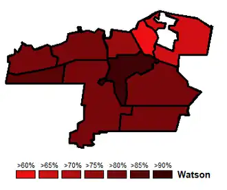 Watson easily won all 10 wards in the city, but was the weakest in the more Francophone wards of Rideau and Bruyère-Strathcona. His strongest ward was Capital, which he had previously represented on city council.[1]