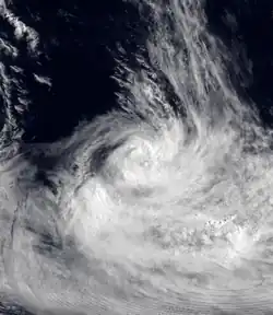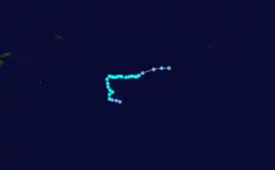 Over the next 3 days, Hali moved towards the west as it gradually intensified further, before early on March 16, an approaching upper trough of low pressure caused a weakness in the subtropical ridge.[1][10] As a result, the cyclone started to move towards the south, while the FMS reported that Hali had reached its 10-minute peak windspeeds of 120 km/h (75 mph), which made it a category 3 severe tropical cyclone on the Australian scale.[7][10] Later that day the FMS reported that the cyclone had started to rapidly weaken because of increasing vertical windshear and cooler sea surface temperatures, and interference from Tropical Depression 20F.[1][8] As a result, the FMS reported at 1200 UTC on January 18, that Hali had weakened into a depression before later that day the cyclone got caught up in the low level steering field and drifted into TCWC Wellington's area of responsibility during the next day.[11] The remnants of Hali were then last noted during March 20, as they dissipated about 1,200 km (745 mi) to the southeast of Avarua on the Southern Cook Island: Rarotonga.[7][2]