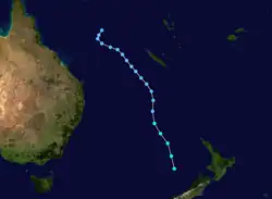JTWC initiated warnings on the system at 15/0900 UTC due to a ship report of 34 kn at 0000 UTC. Bulletins from Nadi alluded to gales being present in the southern and eastern quadrants, but since they were not surrounding the center, the depression was not named as a tropical cyclone. The depression moved southeastward roughly parallel to and several hundred miles southwest of New Caledonia. By 0600 UTC on December 16 the system was about 250 nmi southwest of Nouméa and had moved across 25S and into the AOR of the Wellington, New Zealand, office. The depression turned to the south and accelerated as it began to lose tropical characteristics. It passed about 210 nmi west of Norfolk Island at 1700 UTC, and had become extratropical about 400 nmi west-northwest of New Zealand's North Cape by 0500 UTC on December 17.